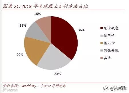根据麦肯锡数据,2018 年全球支付市场规模达到 US$2tn,预计到 2022 年将达到 US$3tn。根据支付的方法不同,可以分为线上支付和线下支付:线上支付手段包括电子钱包、信 用卡、借记卡、网银等,而线下支付主要包括现金、信用卡、借记卡等。