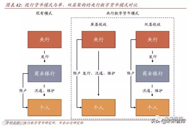 中国央行数字货币采用和人民币相同的运营体系,即“央行-商业银行/其他运营机构-货 币使用者”的双层体系:商业银行及其他运营机构向央行缴纳 100%准备金兑换数字货币, 再兑换给货币使用者。双层体系的优势: