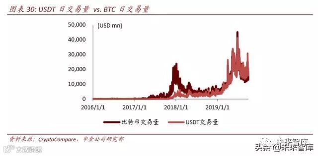 目前,稳定币的交易已成为加密货币市场最活跃的交易。据 CoinMarketCap 数据,近三 个月平均日交易量189.2亿美元,超过比特币的169.3亿美元,是交易量最大的加密货币。从比特币的交易对占比来看,CryptoCompare 数据显示,USDT-BTC 交易对占比特币总交 易量的比例超过 75%。