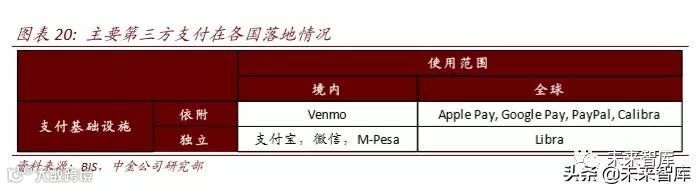 另一方面在本地支付市场,我们认为 Libra 也将会以其高效率、低成本的优势,颠覆网银、 支付宝、微信支付等以本地市场为主的支付系统;或者可能对这些本地支付服务扩张全 球跨境支付业务版图形成阻碍。