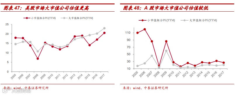 高端酒业绩确定性高,随着我国市场走向成熟,确定性溢价将逐渐得到体现。在理性的市场中大多数投资者为风险厌恶型,因此会给予“确定性”偏高的估值水平,即确定性溢价。从较为成熟的美股市场来看,可以看到大市值公司估值大部分时候都略高于小市值公司;反观我国A股市场,确定性溢价却没有得到体现,小盘股长期估值更贵。我们认为,随着A股市场开放度不断提高,投资理念也在向成熟市场靠拢,在外资介入下市场开始重构估值体系。