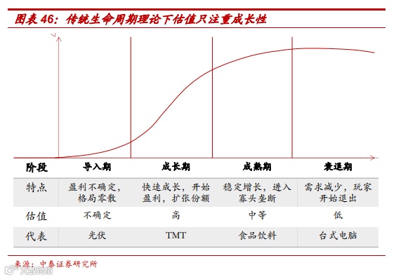传统估值方法只注重成长性,而忽视了确定性。按照传统的企业生命周期理论,食品饮料等消费行业往往处于成熟期,业绩很难出现爆发式增长,因此无法取得过高估值。但是,这种传统估值方法只考虑了公司成长性,即认为只有高增速的公司才能给予高估值,但实际上对于白酒板块来说,尽管行业发展进入成熟期,但仍能保持15%-20%左右的持续增长,这对于6000亿元体量的行业而言已实属不易,理应不能只按照成长性给予估值,而要将持续增长的确定性也考虑在内。