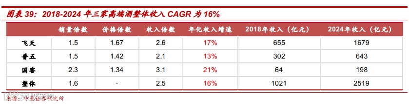 3、收入:2024年,飞天、普五和国窖的收入分别为2018年的2.6、2.1、3.1倍,整体收入CAGR达16%。