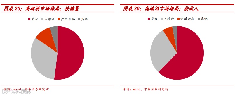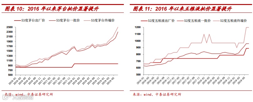 3)量价拆分来看,近年来茅台实际销售额的高增长主要来自于价格提升,五粮液和国窖则主要来自于销量快速增长。
