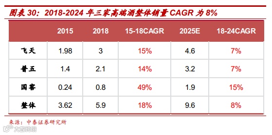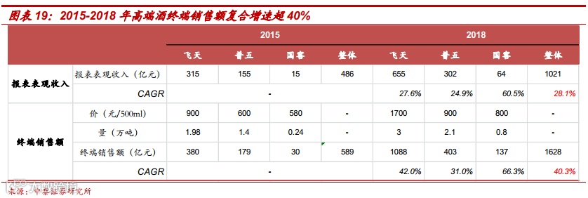 从报表表观收入来看,2015-2018年,飞天、普五、国窖收入CAGR分别为27.6%、24.9%、60.5%,高端酒板块整体收入CAGR为28.1%。