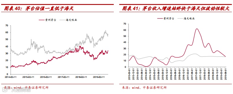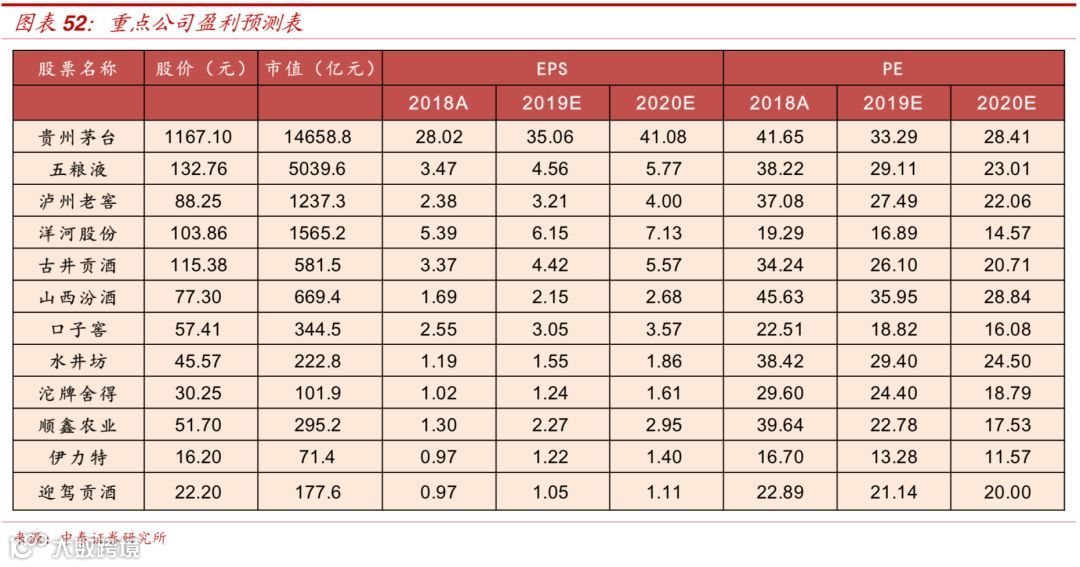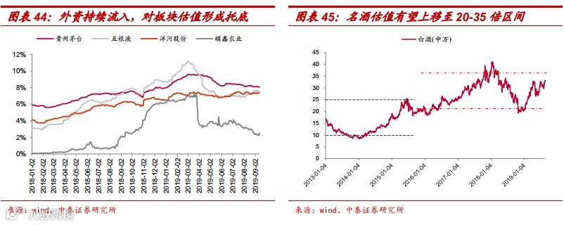 国内白酒龙头估值已超过海外烈酒龙头,未来将成为常态。从海外烈酒与国内名酒近年来的估值走势来看,主要呈现两个特征:第一,海外烈酒估值波动性小,基本围绕25倍波动,而国内名酒则波动较大;第二,2019年以来国内名酒估值持续回升,目前已超过海外烈酒龙头的估值水平,我们认为这在未来将成为常态,正如上文分析,茅、五、泸等国内白酒龙头未来增长确定性高,19年业绩预计均能取得25%以上的高增长,在外资的持续流入下,我们认为高端酒估值中枢有望逐渐向30倍水平抬升。
