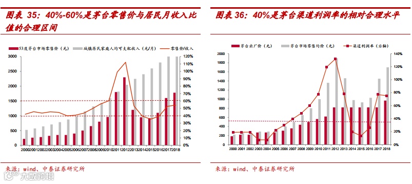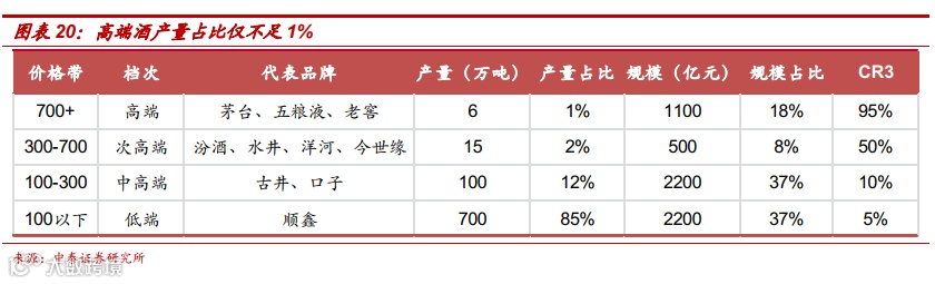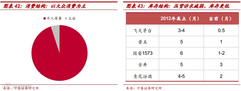 2)按家庭消费。根据茅台董事长李保芳书记,中国目前有3.5亿至4.5亿家庭,若每个家庭就在大年三十除夕之夜喝一瓶,当前茅台酒产量仅能满足6000多万个家庭。我们以此计算,当前三家高端酒总产量也仅能满足1.3亿多个家庭,仅占我国4亿家庭的33%,且大众消费仅占白酒总消费的约40%,可见当前高端酒需求仍有很大潜力待释放。