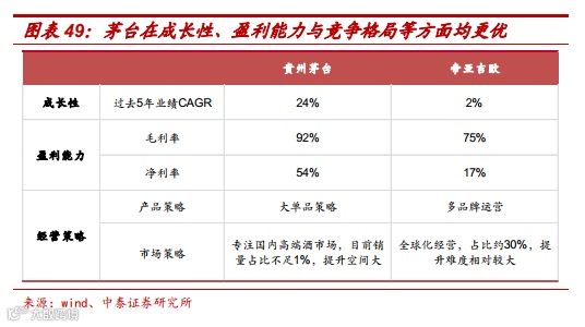 相较于海外龙头,国内白酒龙头成长性更高、盈利能力更强、竞争格局更优,理应享受更高估值水平。我们将茅台与海外烈酒龙头帝亚吉欧相对比,首先成长性方面,近5年帝亚吉欧收入CAGR为2.1%,且波动性较大,而茅台则高达24.4%,成长性明显更高;盈利性方面,2018年茅台毛利率/净利率为92%/54%,远高于帝亚吉欧的75%/17%,盈利能力更强;经营层面,帝亚吉欧坚持全球化、多品牌运营,而茅台以大单品为主,虽然不具备可比性,但相较于帝亚吉欧在全球市场上开疆扩土而言,茅台在所处的中国白酒市场上壁垒更强、格局更优,且“一瓶难求”的稀缺性导致茅台的奢侈品属性更加明显。因此,除了在规模上低于帝亚吉欧之外,茅台的竞争力与发展前景均更具优势,理应享受更高的估值。