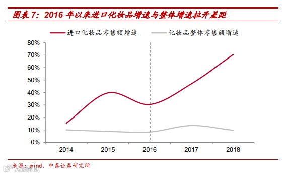 3)化妆品:2016年以来高档进口化妆品增速遥遥领先于整体增速。从化妆品的表现来看,与化妆品整体零售额始终保持约10%左右的增速不同,更为高档的进口化妆品零售额从2016年以来迎来快速增长,2017年、2018年增速分别高达47%和71%,遥遥领先于整体水平,表明在化妆品领域同样存在高档为王的特征。