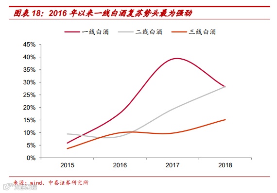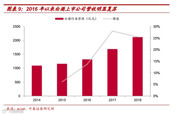 业绩:2016年以来白酒行业明显复苏。下面我们回归白酒。自从2012年白酒“黄金十年”告一段落之后,“三公”风暴将行业推入了三年深度调整期,此后,随着居民收入水平提升以及消费升级持续推进,大众消费承接了政务消费被砍掉之后留下的空白,推动白酒行业重焕生机。2016-2018年,我国白酒上市公司营收复合增长率高达27%,进入新一轮景气周期。