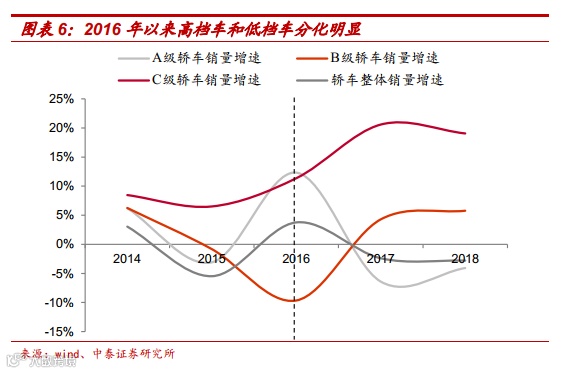 2)豪车:2016年以来高档车快速增长与低档车负增长形成鲜明对比。近两年,在汽车销量整体不振的大背景下,中高档车销量却率先迎来拐点,可以看到2016年以来B级(中档)轿车和C级(高档)轿车销量快速回升,其中高档轿车增速最快,增速连续两年保持在20%左右,与A级轿车以及整体销量2016年以来的负增长形成鲜明对比。