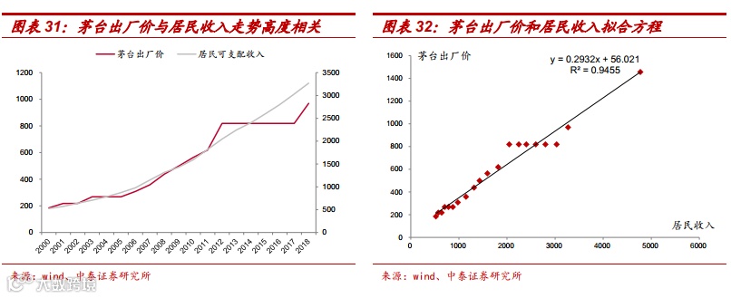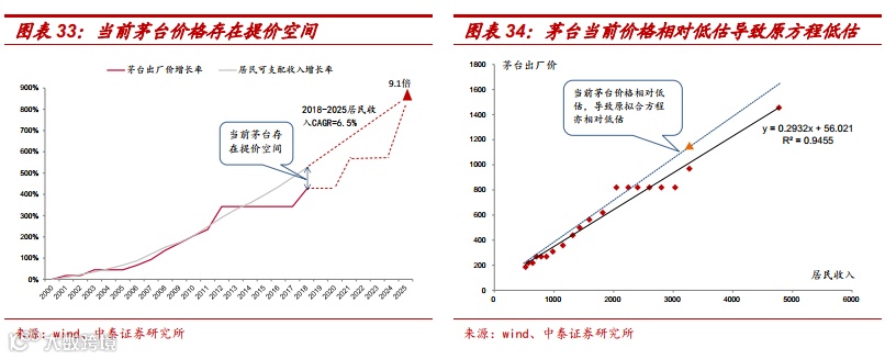 茅台当前存在提价空间。我们进一步观察居民收入和茅台出厂价走势图,可以发现2000-2011年之间,两者走势高度相关,表明居民收入可以很好地拟合茅台价格。但是最近几年,可以看到两者的走势差距是有所加大的,即茅台出厂价增长落后于居民收入增长,表明当前茅台出厂价相对被低估,存在提价空间,茅台当前供不应求的市场表现同样说明了这一点。那么,在当前出厂价偏低的情况下,上文构建的方程(的斜率)其实也是偏低的。如果我们将“茅台出厂价涨幅追平居民收入涨幅(像2000-2011年那样)”视为合理的话,那么,2000-2024年居民收入增长了8.1倍,那么茅台出厂价同样应该增长8.1倍,计算得出2024年茅台出厂价将达到约1687元(185*9.1=1687),那么2024年茅台出厂价区间将为(1455,1687)元。