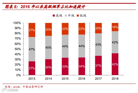 4)名烟:高档烟草的占比2016年以来加速提升。如果说名包名表、化妆品、豪车更多反映了国内消费者对于国外奢侈品品牌的追逐,那么名烟名酒则是这一现象在内资品牌上的体现。随着居民健康意识的增强,烟草和白酒的消费总量是在下降的,但高端品牌的香烟和白酒的消费占比却在持续上升,且2016年以来明显加速。以烟草为例,2013-2016年高级烟草的占比从27%升至34%,三年间提升7%,而2016-2018年这一比例进一步升至42%,两年间提升8%,这与名包名表、化妆品、豪车等奢侈品近两年的火爆表现是相一致的。