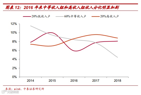 高端酒等奢侈品的主要消费群体集中于富人阶层,近年来收入分化加剧下高收入群体明显扩容,拉动高端酒需求迎来爆发。收入是影响居民消费能力的最重要因素,而收入分化的加剧、“富人”群体的扩大则是白酒等奢侈品消费的主要推动力。如果将我国居民划分为低收入组、中等收入组、高收入组,分别占全国居民的20%、60%、20%,那么我们可以看到,中等收入组和高收入组的收入增速水平近年来分化明显,2016年高收入组收入增速首次超过中等收入组,2018年高收入组收入同比增长8.8%,更是达到了中等收入组的两倍。这表明,2016年以来我国居民收入分化明显加剧,高收入群体收入增长更快,对于白酒尤其是高端白酒的追捧持续升温,推动白酒需求和价格再度迈向奢侈品行业,并有力地带动了国内奢侈品市场蓬勃发展。