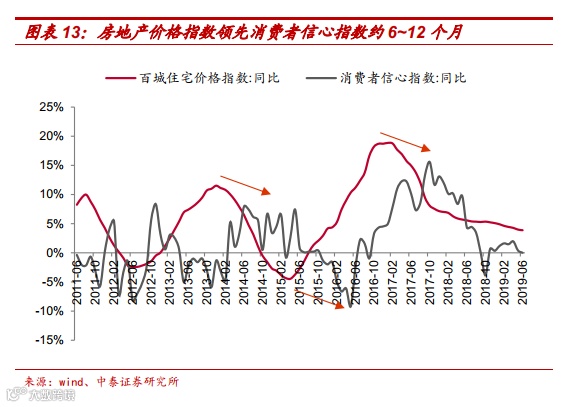 财富效应是怎么影响消费的?居民的消费行为不仅受到当期收入的影响,还会受到居民资产和财富变动的预期影响,因此财富的增值和减值也会影响改变居民消费信心和行为,即财富效应。最典型的当属房地产价格,房价上涨时,财富效应会提高消费信心促使居民增加消费;房价下跌时,居民消费信心不足从而缩减消费。从下图可以看到,房地产价格波动领先消费者信心指数约6~12个月。