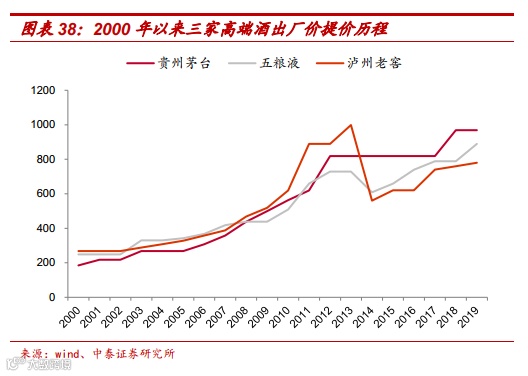 2000-2018年飞天、普五和国窖的出厂价CAGR分别为10%、7%、6%,由于茅台提价方式包括直接提价和间接提价,五粮液和老窖则以直接提价为主,因此我们分别进行讨论。