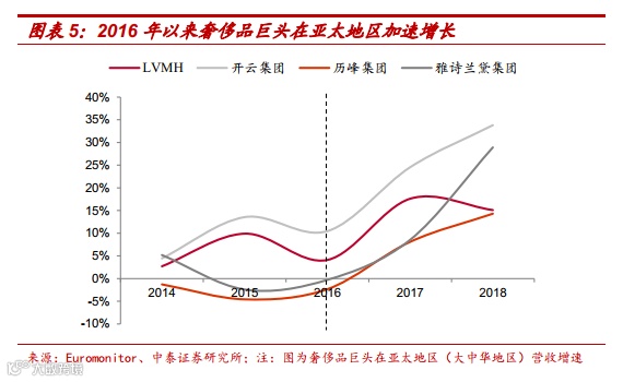 1)奢侈品巨头:2016年以来全球奢侈品巨头在亚太地区取得加速增长。从全球前几大奢侈品巨头在亚太地区的表现来看,2016年以来大多迈入了增速上双的快速成长阶段,且除LVMH之外2018年均取得加速增长,表明以中国为主力的亚太地区正愈发成为全球奢侈品巨头的重要战场,国人对于名包名表、高档珠宝和化妆品的消费能力和消费意愿明显增强。