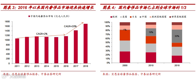 一、整体市场:2016年来国内奢侈品整体市场迎来加速增长
