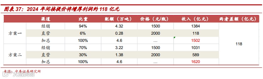 2)间接提价:2024年间接提价幅度约8%。除直接提价之外,销售渠道比重的变化也会影响吨价。当前茅台现阶段零售价和出厂价差距过大,渠道利润率超过100%,渠道利润甚至超过厂家利润,这显然是一种不合理现象。公司目前已明确将逐渐加大直营比重,这将使得渠道利润逐步回流,因此相当于间接提价。我们对此进行测算: