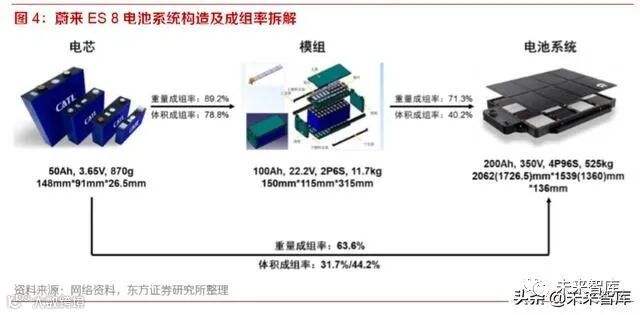 以蔚来汽车的电池系统为例,2018 年 ES8 上市时所用电芯的能量密度为 210Wh/kg,成组之后质 量能量密度仅有 132Wh/kg,重量成组率为 63.6%,体积成组率则仅有 31.7%,由于车身过重以及 风阻系数偏高,以 70kWh 的带电容量 NEDC 续航里程仅有 350km。经过设计改进之后,2019 年 推出的 ES6 基础版(70kWh)NEDC 续航里程达到 430km,高容量的车型(84kWh)续航里程达 到 510km,其质量能量密度和成组率也分别达到 170Wh/kg 和 70%,因此提高电池装载量是改善 汽车动力性的不二法门。