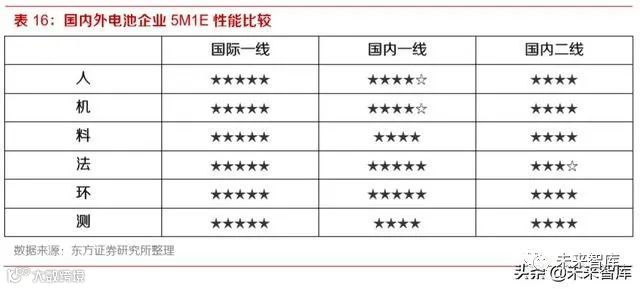 我们认为,在六大要素中,导致电池品质差异的因素主要是材料、技术和环境控制,企业基于各自 的偏好制定不同的竞争战略:国际一线电池企业力求做到全方位最优,因此电池品质最好,成本相 对较高;国内一线巨头追求成本与品质的平衡,选用的材料品质并非最优,但工艺和环境控制能力 出色,因此对内与竞争对手拉开质量差距,对外则具备性价比优势,目前在国内已占据绝对优势, 在海外市场竞争中也能不落下风;国内二线企业前几年过于追求性能参数,工艺能力相对较差,导 致被边缘化。