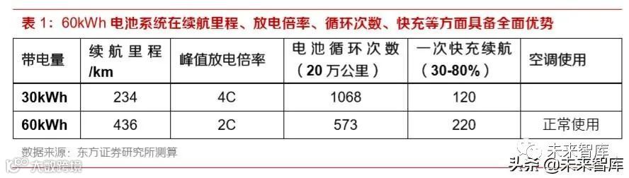 因此,对于电池系统而言,带电量是更具决定意义的参数,质量能量密度的影响相对有限。值得一 提的是,提升带电量还可以缓解诸多困扰电动车的顽疾,以带电量分别为 30kWh 和 60kWh 的两 辆车为例,除了续航里程提升近一倍之外,大容量电池系统还有很多其他优点:首先,大容量电池 系统对于电芯的放电倍率要求降低,整车等速巡航阶段的输出功率约 10kW,但加速阶段输出功率 很大,峰值功率可达 100kW 以上,小系统的瞬时放电倍率要求达到 4C,这对电池寿命造成较大 伤害,而大系统的放电倍率要求仅为大系统的一半;其次,大电池系统的循环次数要求也大为降低, 假设汽车要求行驶里程达到 20 万公里,小系统的循环次数将达到 1100 次,而大系统的循环寿命 要求仅为 570 次,这为更高能量密度、低循环寿命的电池使用开拓了空间;三是充电功率显著提 高,在充电倍率相同的情况下,大系统快充半小时(soc 从 30%充至 80%)即可行驶 220 公里以 上,极大程度上缓解了充电压力,此外,车内空调等其他体验也有明显改善。