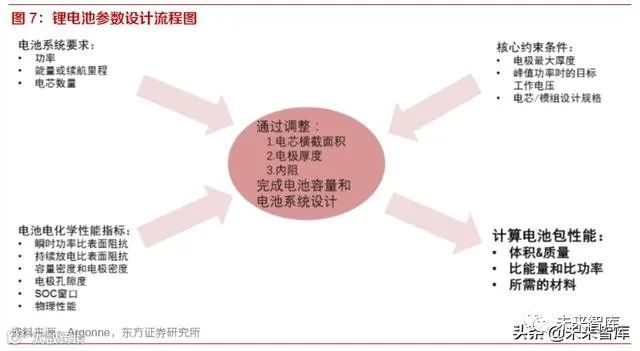 美国阿贡国家实验室提出了一套设计原则,规则要求用户输入多个设计参数,例如电池电量,电池 和模组数量,以及最大功率下的目标电压等。此外,用户必须输入以下三种能量测量值之一:电池 组能量,电池容量或车辆电气范围,定义其中一个值将决定其他两个值。然后,迭代过程通过改变 电池容量和电极厚度来解决用户定义的能量参数(能量,容量或范围)和剩余电池特性。结果是电 池,模组和电池组的尺寸,质量,体积和材料等方面的要求。