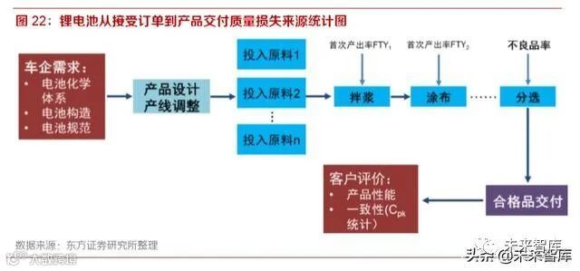锂电池单体大量成组后才能使用,因此电芯的各项参数指标合格只是基本要求,品质一致性在供应 商评估过程中具有很高权重。此外,进行大批量生产的时候,一个单体的成本主要是取决于材料成 本和生产过程中的废品率。因此,电池在材料和设计上的优点能否得到大批量高品质的复制才是决 定其成本和市场竞争力的关键,这主要取决于工业生产的过程能力。
