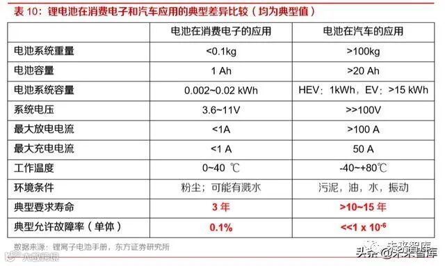 电动车的电池系统由数百个甚至数千个电芯连接而成,由于木桶效应,电池系统的性能取决于电池 包里性能最差的电芯。此外,与消费电子产品相比,电动汽车由于放电电流、工作电压以及工作环 境都更加严苛,动力电池允许的故障率较消费锂电池低 2-3 个数量级,因此质量要求更加苛刻。
