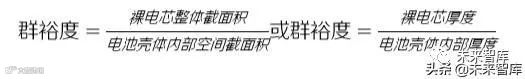 横截面上,在电池设计中,通常采用群裕度这个概念来表征电芯的空间填充度。群裕度是指电池实 际内部横截面积与最大内部截面积的比例,即,将电芯横向切开,其中卷绕式电芯中各种物质的截 面积与电池壳体内径包含的面积的比值,可以表征卷绕式电芯的入壳的困难程度、电芯充电膨胀后 对壳体的压力等。群裕度的计算方式有两种,分别是:
