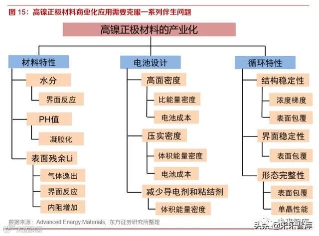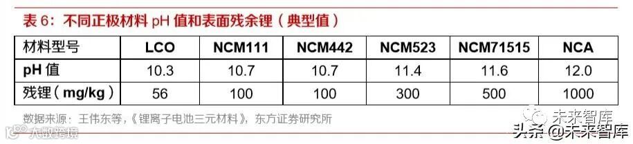 高镍材料表面的碳酸锂和氢氧化锂杂质不易控制,杂质容易超标,这些残留锂化合物主要是 Li2O、LiOH·H2O、Li2CO3等碱性物质,残留物越多,材料表面的 PH 值越大。碱性物质在 空气中容易吸潮,导致材料表面和水反应,或使材料在调浆时黏度变大,或者将多余的水分 带入电池中,造成电池性能下降。调浆黏度变大的原因是黏结剂 PVDF 团聚,使正极浆料黏 度变大难以过筛,情况严重时浆料变果冻状,成为废料。