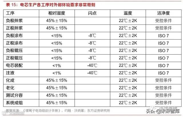 环境(Environment):锂电池生产对于环境的要求非常苛刻,主要是温度、湿度、颗粒物管 理等,温度方面,锂电池所有工序温度波动不超过 2℃;湿度方面的要求更为严格,涂布和辊 压过程要求湿度不高于 15%,电芯装配和注液过程需要湿度降至 1%以下,值得一提的是, 随着高镍材料的推广,电池生产对湿度的控制将进一步严苛,所有流程必须控制在10%以下;颗粒物附着在极片表面,制成电芯后会严重影响电池的循环性能,甚至可能造成短路引发热 失控,并且随机分布不易观测,因而对电芯一致性有着巨大的影响,颗粒物一方面来自外部 环境,而在混浆、涂布、辊压、模切等环节也会导致新的颗粒物产生,厂房里工人的活动也 会有影响,涂布、辊压和装配环节要求环境的洁净度至少达到 ISO 7 级标准,即细颗粒物浓 度为 30 万个/立方米,实际上标准越高越好,颗粒物浓度一方面取决于厂房硬件设施,另一 反面取决于工厂的管理水平,因此环境控制能力的差异对电芯品质也有很重要的影响。