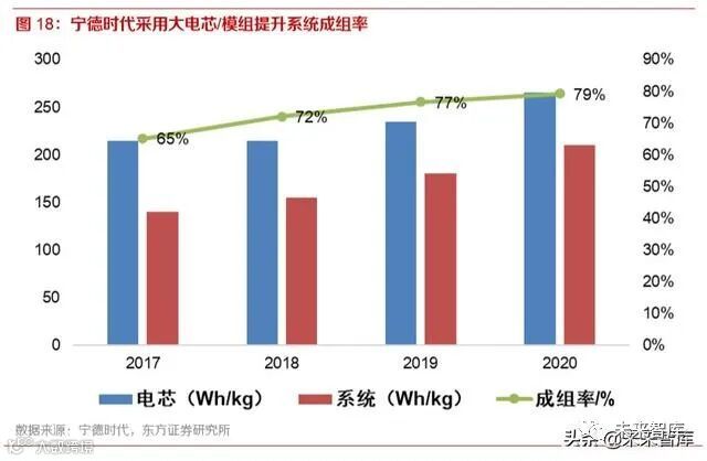 以宁德时代电芯变化轨迹为例,2017 年宁德时代电芯规格以标准尺寸为主,成组效率仅有 67%;随后几年里凭借更大的电芯和模组,电池系统的成组率不断提升,2019 年下半年公司推出 CTP (cell to pack)产品,直接省略了模组的保护,其成组效率有望达到 80%。在材料体系没有发生 根本变化的情况下,将系统能量密度提升了 50%。