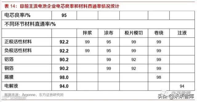 阿贡国家实验室假设的电芯良率及主要材料的直通率拆解如下所示,实际上各厂家的相关数据差 异较大。良率方面,一线企业的电芯良率可达 96~97%,较好的二线企业仅有 92~93%,在其他条 件均不变的情况下,5 个百分点的良率差异会导致成本端相差 0.023 元/Wh;直通率方面,一线企 业正极材料的直通率可达 95%以上,二线勉强接近 90%,5 个点的直通率差异导致成本端相差 0.015 元/Wh。因此,仅考虑质量损失,一二线企业之间即可造成 0.035 元/Wh 以上的成本差异。