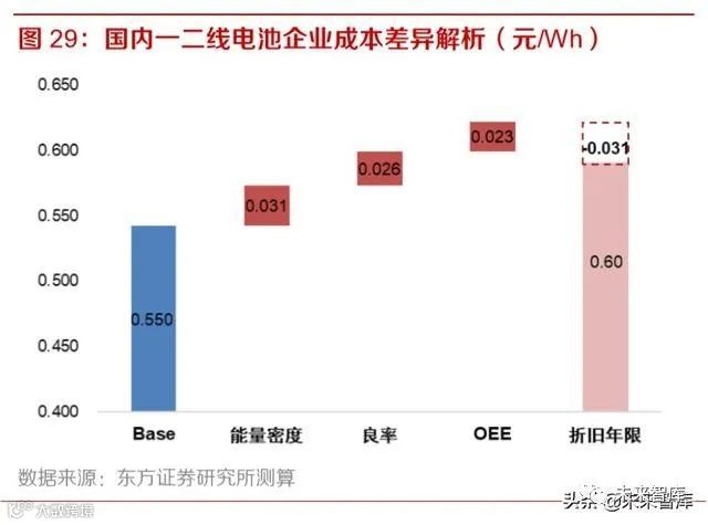 国内市场竞争已充分演绎了正反馈闭环的威力。技术上,一线电池的单体能量密度较二线高出 6.4%, 从而摊薄了物料成本;品控方面,一线电池的良率较二线高出 5 个百分点,材料直通率高出 3 个 百分点,影响成本 0.026 元/Wh;规模对折旧成本影响显著,目前一线龙头 OEE 可达 80%左右, 二线不足 50%,成本差异进一步放大;折旧政策方面,国内外一线企业均采用五年加速折旧,国 内多选择 10 年折旧,一定程度上遮掩了二者成本差距。