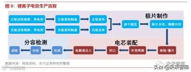 自 1991 年索尼公司实现锂电池商业化生产以来,锂电池在性能与生产工艺上实现了长足的进步, 但其工作原理、产品结构及其生产流程总体上并未发生很大变化。概而言之,锂电池电芯的制造可 以分为 3 个主要生产环节,约 15 个生产工序:
