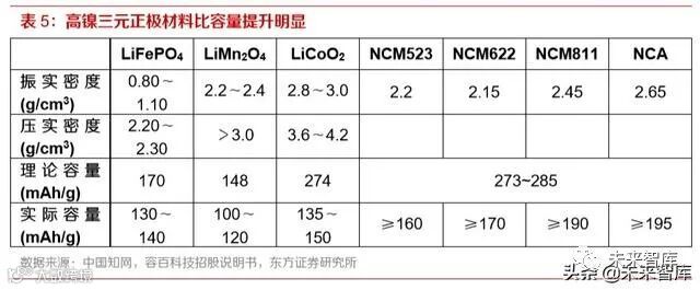 高镍化至少能带来两方面好处,一是降低钴资源的用量,减轻上游资源价格波动带来的价格波动, NCM811 相比NCM523 的钴含量由12.21%降至 6.06%,折算到动力电池每kwh 用钴量从0.22kg 降至 0.09kg,因此在钴价越高时,NCM811 的材料成本优势将越明显。例如,在金属钴 20 美元/ 磅时,高镍三元材料单位容量成本低 8%;在金属钴 30 美元/磅时,高镍三元材料单位容量成本低 12%;二是提升能量密度,降低电池每 Wh 成本,2015 年以来三元材料从 333 过渡到 622,比容 量从 150mAh/g 提升至 170mAh/g 以上,电芯能量密度则从 180Wh/kg 提升至 260Wh/kg。目前广 受关注的 811 系材料已经开始使用,Ni 含量更高的材料也在研发之中,可以说高镍化是材料发展 不可动摇的趋势。