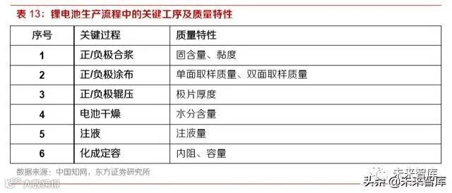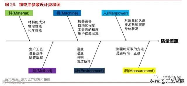 方法(Method):锂电池生产的工艺方法总体上相近,但是具体的工艺点都有特色,例如, 仅在制片环节,正极、负极浆料的配方、搅拌速度、添加剂种类和用量都有无数种组合,卷 绕时张力调节、烘干的温度和时间也各有差异,锂电池生产流程非线性耦合的特点决定了各 厂商在这上千个工艺点的区别是造成产品质量差异的主要原因。