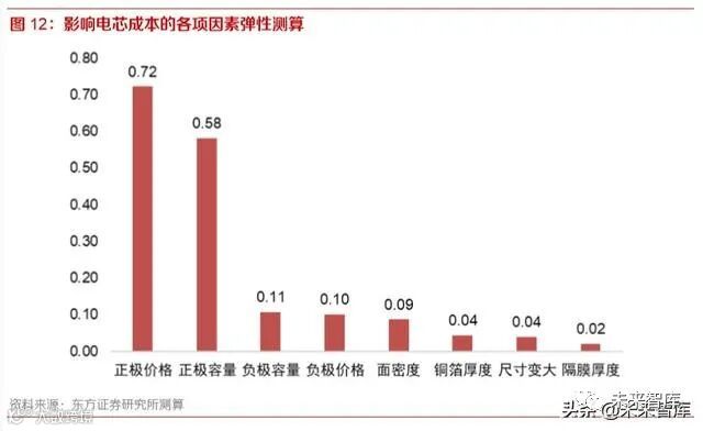 对成本模型中的主要参数进行敏感性分析,对成本影响最大的因素是正极材料的性能和价格,负极 性能和价格影响位居其次,但弹性系数已相差较远,此外,降低非活性材料的各项措施(提升活性 材料面密度、降低载体厚度、增大电芯尺寸等)尽管单项影响都不大,但累计起来降本效应也不容 小视。