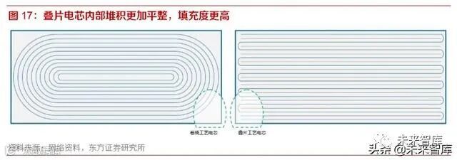 此外,目前方形电池的装配多选用卷绕工艺,卷芯成型后弯曲的部位难以避免留下空隙,这进一步 降低了内部空间的填充率。因此,改善空间利用率也多从如下途径实现,一是选用叠片装配工艺, 二是减少非活性材料的体积占比,三是增大电芯内部尺寸摊薄非填充空间的比例。