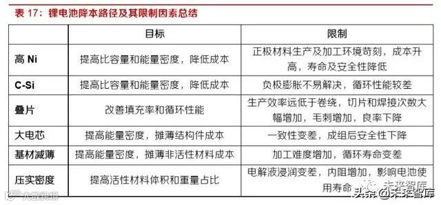 能量密度提升有如下路径,一是采用高比容量的活性材料,即正极高镍化和负极用硅碳材料;二是 优化工艺提高活性材料的重量占比,包括提升面密度、压实密度、卷绕改叠片、降低铜箔、铝箔、 隔膜等材料的厚度;三是提高电芯尺寸,挖掘规模效应。此外,在系统层面上还可以改进成组技术, 降低模组、PACK 等封装成本。
