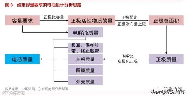 对于有容量要求的电池,在材料体系选定后,根据正极活性物质的比容量即可计算出正极活性物质 的质量,再根据正极配比(活性物质、导电剂、黏结剂的配比)和涂布量上限即可计算出这些活性 物质需要涂布在多大面积的集流体上,即求得正极总面积。随后根据电子平衡原则和防短路要求, 电芯的负极和隔膜用量也可求得,据此可以得出整个电芯的物料用量。因此,正极材料的性能和用 量是电芯容量的决定性因素。