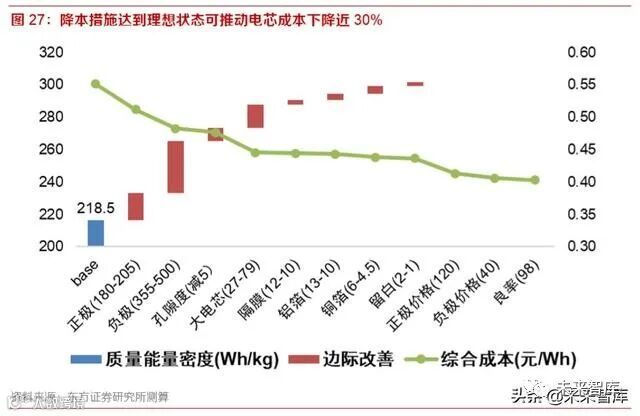 我们将各项降本措施全部实施,不考虑卷绕转成叠片,电芯的综合成本可以降至 0.4 元/Wh,假设 电芯成本占系统为 85%,则系统成本可降至 0.47 元/Wh,毛利率为 25%时其售价可降至 0.7 元 /Wh(含税),从而实现 2025 年的行业降本目标。