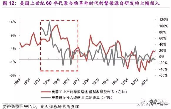 当下中国经济已经告别了高增长阶段,不论是房住不炒的顶层设计,还 是海外逆全球化浪潮带来的贸易端的压力,都决定了我们的经济模式将转向 产业升级和创新驱动,包括科创板的设立,以及 2018 年 7 月国务院常委会 议宣布将企业研发费用加计扣除比例提高到 75%的政策由科技型中小企业 扩大至所有企业,并对已确定的先进制造业增值税留抵退税返还政策来看, 都正在朝这一目标努力。不同于中国这些年地产驱动的增长模式,我们可以 看到美国市场过去这些年的成功来自于创新驱动的增长模式,他们的经济增 长更多来自于知识产权领域和研发的投资,即使资本市场出现阶段性的泡沫, 最后也会通过创新来消化掉。具体到化学工业和材料行业来看,上个世纪 60 年代研发驱动下的聚合物/石油化学品时代的繁荣给我们留下了深刻的印象。