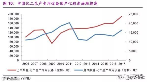 这种情况在煤化工领域格外显著,尽管世界上各种煤化工技术很早就走 出实验室并寻求工业化,但只有在现代中国才促成了各种煤基化学品的爆发 式繁荣,大型气流床煤气化、直接煤制油、间接煤制油、煤制烯烃、煤制乙 二醇、万吨级煤制芳烃、低阶煤的分质利用和合成气的变换技术相继获得成 功示范和运行,除了资本保障的国外技术集成之外,装备自主化是另外一个重要的因素,2000 吨/天的大型气化炉、大型变换炉、低温甲醇洗、12 万等 级的空分设备、8 万等级以上的空压机、百万吨煤制油反应器、60 万吨级 MTO 反应器等的突破促成了国内煤化工行业的繁荣。而除了煤化工工艺的 革新之外,我们在 MDI 等大体量的化学品方面,或者通过自主开发,或者通 过技术的引进吸收也逐渐实现了进口替代。
