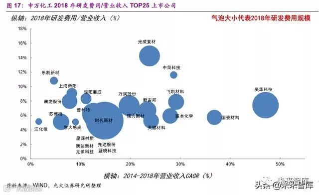 从海外来看,跨国企业遭遇增长极限之后,已经将重心重新指向了利润率 更高的利基市场。未来包括中国企业在内的新兴市场参与者与跨国企业的 战场将全面转向专用化学品,而这种竞争必然以研发和创新为核心。如果 我们从两个维度观察,一是研发投入的绝对规模,以万华化学为代表的 各子行业一线龙头正在实现专用化学品领域的边界突破,通过多元化的 转型向全球巨头发起冲击;二是研发费用占比较高的企业,即新材料行 业的领军力量,它们随着面板显示、半导体、5G 等下游应用场景向国 内的产能转移,有望崛起为细分领域的隐形冠军。