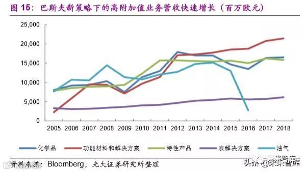 尽管海外并购可以快速提升本土化工企业的技术水平,但研究巴斯夫等 海外巨头的经历,发现他们通过并购完成多元化的转型之后,有可能进入盈 利能力的增长陷阱。巴斯夫从 1990 年开始调整业务板块,通过收购来提升 化学品、塑料、特性产品、农业与营养品、石油与天然气五大核心板块的专 业化和市场地位。但产品系列趋于更加多元化之后,尽管巴斯的营收从 1995 年的 236.37 亿欧元增长至 2000 年的 359.46 亿欧元,但净利润却从 1995 年的 12.63 亿欧元下滑至 2000 年的 12.4 亿欧元,与营收增长形成很大的背 离,此外 ROE 从 1990 年代中期的 14%左右下降至 2003 年的 6%。分析这一 阶段巴斯夫盈利能力的减弱,主要是因为研发能力下降所致,巴斯夫的研发 投入从 2000 年的 15.26 亿欧元下滑至 2003 年的 11.05 亿欧元,大幅削弱 了在特性产品、功能材料和农业解决方案业务等高附加值创新产品上的盈利 能力。针对这一阶段出现的问题,巴斯夫在 2004 年调整了发展战略,加大 以终端客户为导向的研发投入,开拓附加值更高的新产品范围。此后巴斯夫 的营业收入从 2003 年的 333.61 亿欧元上升至 2017 年的 644.75 亿欧元, 净利润从2003年的9.1亿欧元上升至2017年的60.78亿欧元,ROE从2003 年的 5.7%恢复至 2017 年的 13.3%,这种重视优势业务和研发创新的新策略 下获得了极大成功。