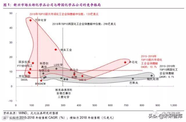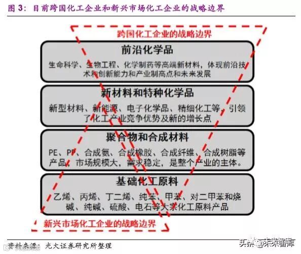 尽管新兴市场国家的化工企业已经从规模上接近顶级的跨国企业,而从 产品结构、创新能力对化学学科的贡献程度、生产效率等来看,来自新兴市 场的参与者在未来很长一段时间内仍将是海外巨头的追随者。但纯粹的数字 掩盖了细分市场间的差异,目前新兴市场的参与者主要从事基础化学品和树 脂的生产,而跨国公司则基本上完全掌控了特种化学品、工业气体、农用化 学品的市场。我们观察全球化工行业上百年的发展历程,发现像巴斯夫、杜 邦、陶氏和孟山都等这些在激烈的竞争中幸存下来的伟大跨国公司,均具备 极强的自我学习和演进能力,他们的成立、壮大、发展、并购和分拆基本上 都遵循了以下主题:进入壁垒的构筑、战略边界的确立、增长极限的遭遇、 寻找并确立新的战略边界。那么面对当前环境下跨国巨头和新兴市场化工企 业不断在竞争中战略边界的重塑,中国未来又有哪些企业,将从何种方向去 突破,并能够与那些化工巨头渐行渐近?这将是我们在本篇报告中要讨论的 问题。