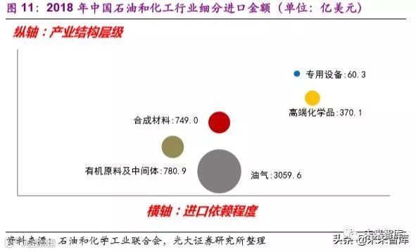 除了上面这些化学品之外,我们还可以看到 PMMA、PPS、芳纶、锦纶、 碳纤维、氯化法钛白粉和维生素等特种树脂/纤维和专用化学品领域也已经实 现技术上的突破,它们和基础化学品相比拥有更多的生产诀窍和技术难点, 我们或通过自主研发,或通过引进技术后的消化吸收,在国产替代的路上越 走越宽。尽管我们已经取得了如此众多的成就,但我国在 2018 年石油和化 工行业的进出口贸易逆差仍然高达 2832.5 亿美元,除了资源禀赋导致的 3059.6 亿美元的油气进口之外,仍需要进口高达 780.9 亿美元的有机原料及 中间体,749.0 亿美元的合成材料,370.1 亿美元的高端化学品和 60.3 亿美 元的专用设备。一些关键材料领域的产业化规模、产品质量等还远远不能满 足国内的需求,根据 2018 年工信部对 130 多种关键基础材料的调研结果显 示,国内 32%的关键材料仍为空白,52%依旧依赖进口。