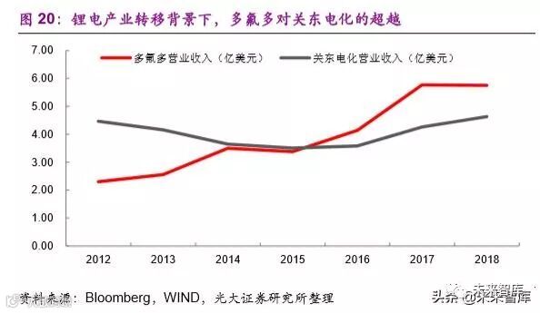 随着韩国以及中国竞争者的崛起,日本企业的市场份额很快受到侵蚀, 整个锂电产业进入了不再以技术实力决胜负,而是大规模设备投资和生产效 率提高决定收益的时代。曾经的电解液材料巨头关东电化工业株式会社,与 森田化学同为全球知名的六氟磷酸锂生产企业,是最早规模化生产六氟磷酸 锂的企业。过去十年随着全球锂电池产业链向中国市场的转移,关东电化立 足于日本国内市场的策略趋于保守,其六氟磷酸锂产能直到 2016 年才扩张 至 5400 吨,从公司营收来看,2018 年实现 4.63 亿美元,仅仅略超过 2012 年时的水平,关东电化领先的技术优势显然没有有效转化为市场份额优势, 不断被多氟多等中国市场的参与者超越。